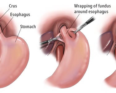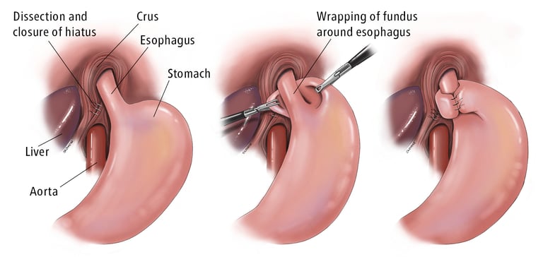 Las funduplicaturas de Nissen, Toupet y Dor son procedimientos quirúrgicos que tratan la enfermedad por reflujo gastroesofágico (ERGE) y las hernias de hiato. Consisten en envolver el fondo gástrico alrededor del esófago. La principal diferencia entre los tres procedimientos radica en el grado en que el estómago se envuelve alrededor del esófago.